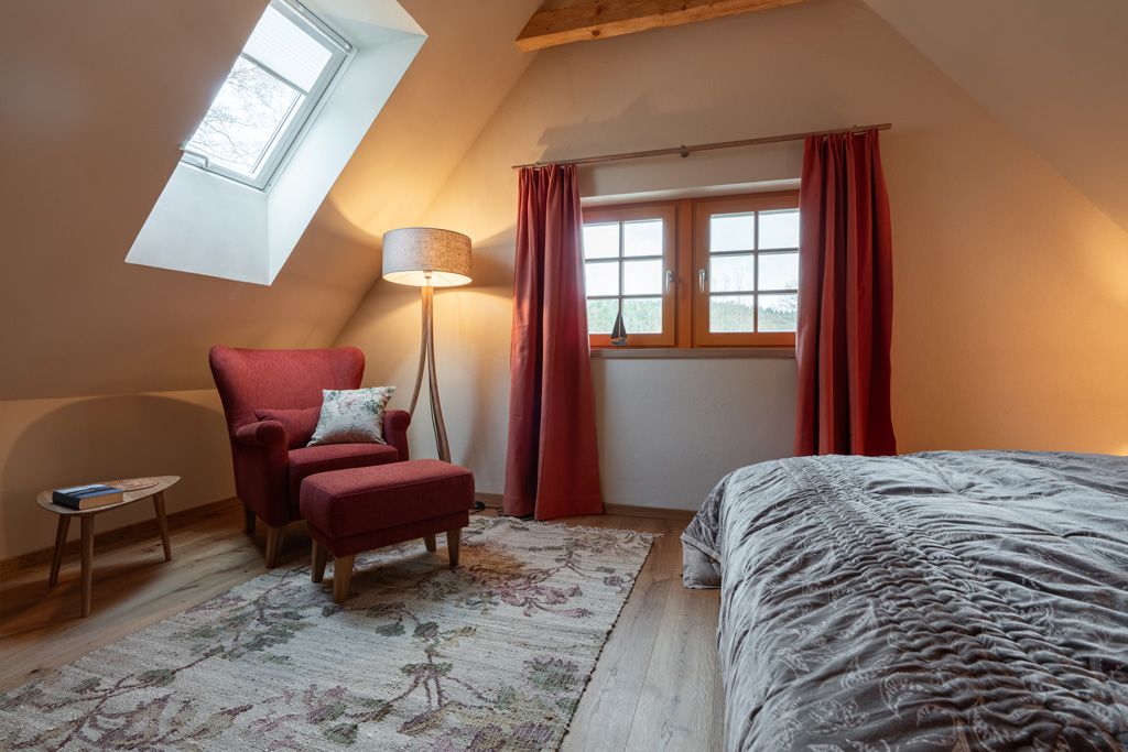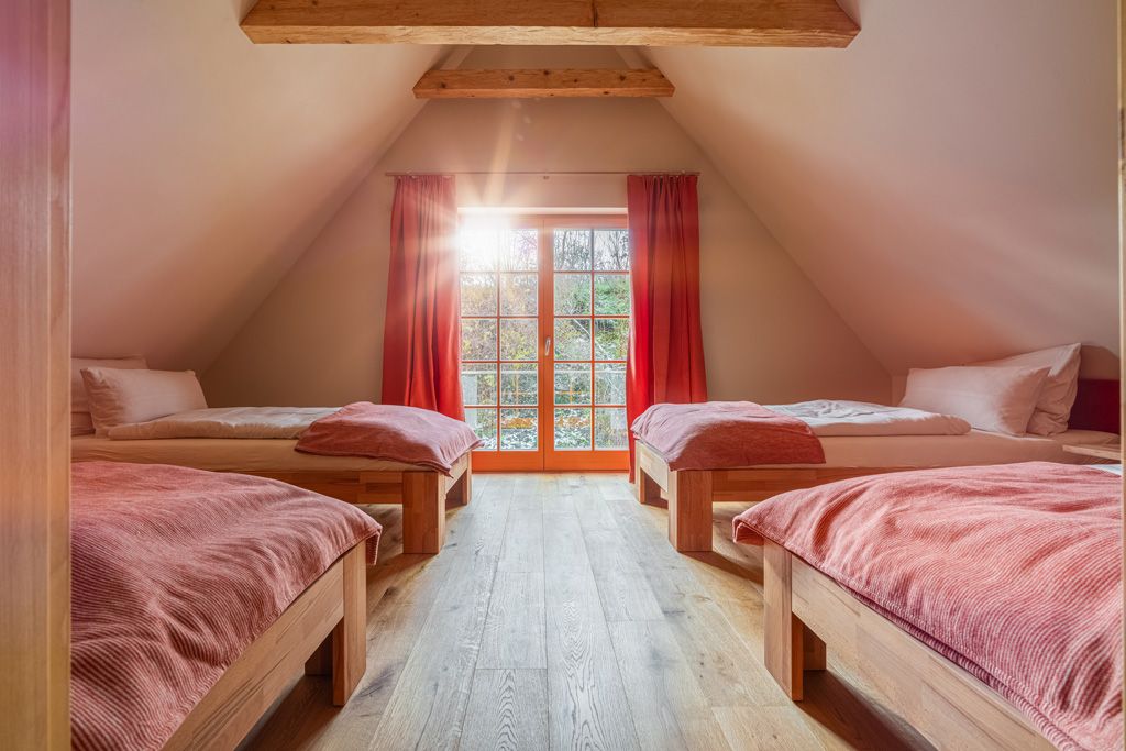 Herzlich willkommen im Ferienapartment Kornblume! Dieses großzügige Apartment im Dachgeschoss bietet auf 122 m² Platz für 6 bis 8 Personen und ist ideal für Familien oder Gruppen. Es erwartet euch eine gemütliche Atmosphäre mit drei Schlafzimmern: Ein Zimmer mit einem Doppelbett (180 cm breit) und Kuschelsessel unter dem Dachfenster zum Sterne gucken, eines mit zwei Einzelbetten (200 cm x 90 cm und 175 cm x 90 cm) und eines mit vier Einzelbetten (200 cm x 90 cm).
