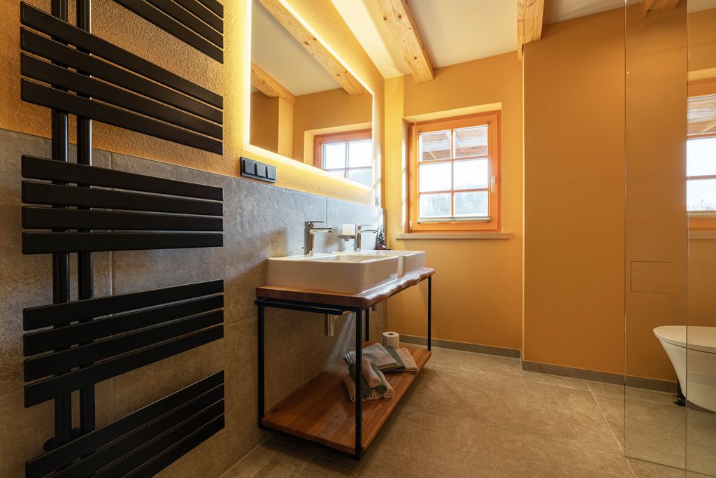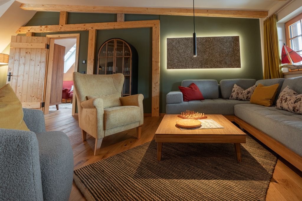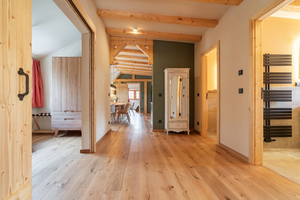 Die Eichenholzdielen und die umweltfreundliche Fußbodenklimatisierung sorgen für ein angenehmes Raumklima – im Winter kuschelig warm und im Sommer angenehm kühl. Das alles mit Naturstrom!