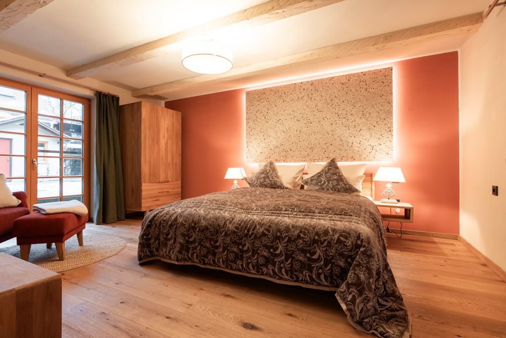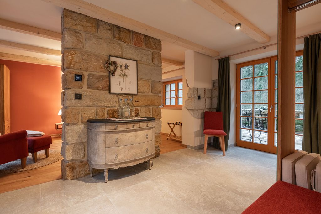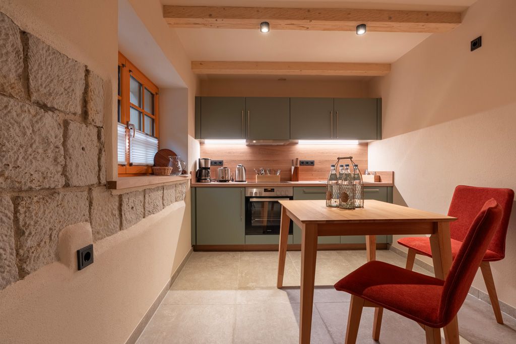 Das Apartment Löwenzahn liegt im Erdgeschoss, ein stiller Ort für zwei. Das Schlafzimmer mit Doppelbett und die kleine, einladende Küche verbinden sich sanft zu einem Ort der Ruhe. Eine Sandsteinwand im Flur und Schlafzimmer, naturbelassen, zieht den Blick an. Das Eichenholzparkett verleiht dem Raum Wärme und die Terrasse öffnet den Blick auf die weite Natur, wo der Tag sanft ausklingen kann.